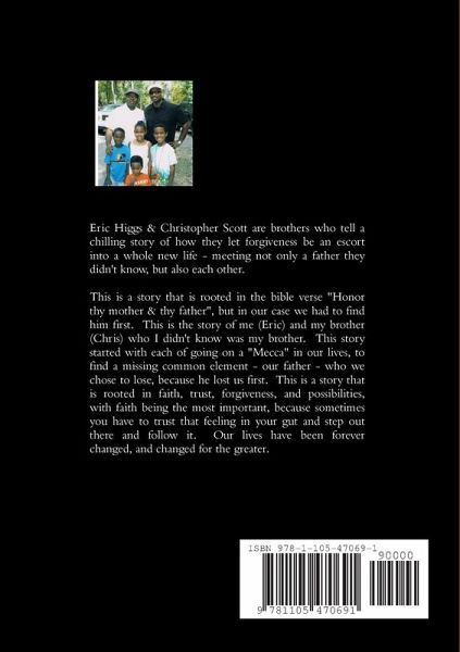 This is a story that is rooted in the bible verse "Honor thy mother & thy father", but in our case we had to find him first. This is the story of me (Eric) and my brother (Chris) who I didn't know was my brother. This story started with each of us going on a "Mecca" in our lives, to find a missing common element - our father - who we chose to lose, because he lost us first. This is a story that is rooted in faith, trust, forgiveness, and possibilities, with faith being the most important, because sometimes you have to trust that feeling in your gut and step out there and follow it. Our lives have been forever changed, and changed for the greater.