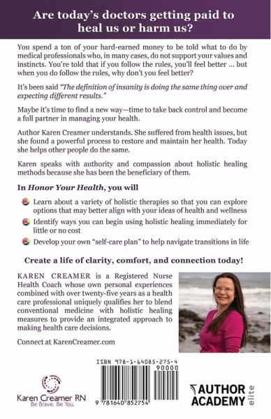 Are today’s doctors getting paid to heal us or to harm us? You spend a ton of your hard-earned money to be told what to do by medical professionals who, in many cases, do not support your values and instincts. You’re told that if you follow the rules, you’ll feel better … but why don’t you feel better? It’s been said "The definition of insanity is doing the same thing over and expecting different results." Maybe it’s time to find a new way—time to take back control and become a full partner in managing your health. Author Karen Creamer understands. She suffered from health issues, but she found a powerful process to restore and maintain her health. Today she helps other people do the same. Karen speaks with authority and compassion about holistic healing methods because she has been the beneficiary of them. In Honor Your Health, you will · Learn about a variety of holistic therapies so that you can explore options that may better align with your ideas of health and wellness · Identify ways you can begin using holistic healing immediately for little or no cost · Develop your own "self-care plan" to help navigate transitions in life Create a life of clarity, comfort, and connection today!