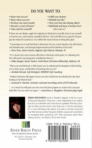 Do you want to: ¿ Know who you are? ¿ Know whose you are? ¿ Develop your inner beauty? ¿ Become a vessel of honor? ¿ Value and love yourself? ¿ Fulfill your destiny? ¿ Rebuild your life? ¿ Turn your hurt into helping others? ¿ Build faith and hope in broken lives? ...then read on! If these are your desires, apply the scriptures in this book to your life, learn to see yourself as God sees you, and immerse yourself in His love. The Lord will set you apart for the purpose for which He created you. You will be His vessel of honor to bring Him glory. "I encourage you to read this book to determine that you cancel rejection, low self-esteem, and abandonment, and through forgiveness demand the freedom of the Lord." -Riva Tims, Senior Pastor, Majestic Life Church, Orlando, FL "It's a shame that many women will relate to this book and its pain; it's a blessing that they will receive encouragement and direction from it." -Mike Stangel, Senior Pastor, North Shore Christian Fellowship, Haleiwa, HI "When you read this book, it will awaken you to understand the deceptions while leading you to truth, peace, and freedom of knowing who you are!" -Michele DeCaul, Life Strategist, EMERGE! Life Coaching "I believe this book will inspire women not only to find their true identity but also their healing in the Word of God." -Leonard D. Daniels, minister, national recording artist, JUSTUS Records "...it's a book that will push you into your God-given purpose no matter what your past looks like! You can start over again."-Lavarious A. Slaughter, Christian playwright