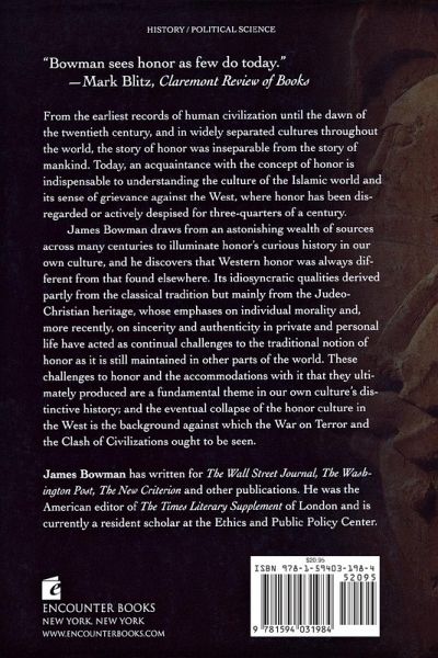 The importance of honor is present in the earliest records of civilization. Today, while it may still be an essential concept in Islamic cultures, in the West, honor has been disparaged and dismissed as obsolete. In this lively and authoritative book, James Bowman traces the curious and fascinating history of this ideal, from the Middle Ages through the Enlightenment and to the killing fields of World War I and the despair of Vietnam. Bowman reminds us that the fate of honor and the fate of morality and even manners are deeply interrelated.