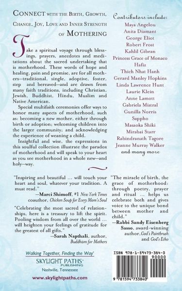 Blessings, prayers, anecdotes and meditations from many faith traditions about the sacred undertaking that is motherhood. These words of hope and healing, pain and promise are for all mothers-traditional, single, adoptive, foster, step and bereaved.