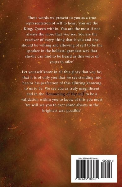 These words we present to you as a true representation of self to hear; 'you are the King/ Queen within. You are the most if not always the more that you see. You are the receiver of every-thing that is you and one should be willing and allowing of self to be the speaker in the boldest, grandest way that she/he can find to be heard as this voice of yours to offer'. Let yourself know in all this glory that you be, that it is of only you that we see standing into her/or his perfection of this alluring knowing to us to be. We see you as truly magnificent and in the Honouring of thy self to be a validation within you to know of this you must 'we will see you to ever shine always in the brightest way possible'.