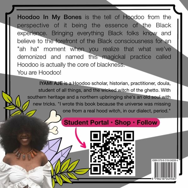 Hoodoo In My Bones is the tell of Hoodoo from the perspective of it being the essence of Black culture. Bringing everything Black folks know and believe to be true to the forefront of the Black consciousness for an "ah ha" moment when you realize this magical practice we call Hoodoo that's been demonized is the core of blackness. You are Hoodoo! Iyami Aje helps the reader see black ritual and superstitions through new eyes, helping you find the magick on the tongue of your elders. "Hoodoo In My Bones", focuses on "Hoodoo Medicine" and root work as the most influential aspect of Hoodoo, helping you remember the medicine of our ancestors. Finally, a Hoodoo read that brings together the spiritual and medicinal use of herbs, for there is no one without the other, this book also includes a complete "herbal dictionary". With rituals and medicines, tried and true, Iyami Aje is an old soul with new tricks. Everything she does is beautiful, and so is this book, from front to back. It's 400 pages in color, each page done beautifully, and packed with ancestral wisdom, yet it's not too heavy for the beginner. This girl really showed up and showed out, per usual!