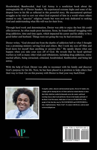 Hoodwinked, Bamboozled, And Led Astray is a nonfiction book about the unimaginable life of Dexter Sanders. He experienced extreme highs and some of the deepest lows in his life as reflected in this powerful story. He encountered spiritual struggles as he tried to sort out what God expected of him in a world where others seemed to only "practice" religious rituals but were not truly dedicated to seeking God and understanding what His will was for their lives. Through hard work and determination, Dexter was able to enjoy the best life could offer, however, he often made poor decisions. Soon, he found himself struggling with drug addiction, time and time again, which impacted his career and his ability to be a good father and husband. Things were not going the way he had envisioned. Dexter writes, "God elevated me from the depths of addiction hell to what I thought was a promising ministry serving God and others. But I took my eyes off Him and lived more for myself than anything or anyone else." He openly shares what can happen when you take your eyes off of God. He reveals that he faced spiritual warfare as well as many other trials and tribulations, including drug addiction, extra-marital affairs, being ostracized, criticized, hoodwinked, bamboozled, and being led astray. With the help of God, Dexter was able to reconnect with his family and discover God's purpose for his life. Now, he has been placed in a position to help others find their way to God. Go on this journey with Dexter to find your way back2God.