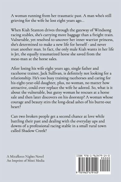 A woman running from her traumatic past. A man who's still grieving for the wife he lost eight years ago... When Kiah Stanton drives through the gateway of Windsong racing stables, she's carrying more baggage than a freight train. Vulnerable, yet resolved to uncover her inner warrior princess, she's determined to make a new life for herself - and never trust another man. In fact, the only male Kiah wants in her life is Jet, the equally traumatized horse she saved from the meat-man at the horse sales. After losing his wife eight years ago, single father and racehorse trainer, Jack Sullivan, is definitely not looking for a relationship. He's too busy training racehorses and caring for his eight-year-old daughter, plus, no woman, no matter how attractive, could ever replace the wife he adored. So, what is it about the vulnerable, but gutsy woman he rescues at a horse sale and then later discovers on his doorstep? A woman whose courage and beauty stirs the long-dead ashes of his burnt-out heart? ¿Can two broken people get a second chance at love while battling their past and dealing with the everyday ups and downs of a professional racing stable in a small rural town called Shadow Creek?