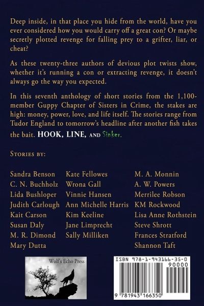 Deep inside, in that place you hide from the world, have you ever considered how you would carry off a great con? Or maybe secretly plotted revenge for falling prey to a grifter, liar, or cheat? As these twenty-three authors of devious plot twists show, whether it's running a con or extracting revenge, it doesn't always go the way you expected. In this seventh anthology of short stories from the 1,100 - member Guppy Chapter of Sisters in Crime, the stakes are high: money, power, love, and life itself. The stories range from Tudor England to tomorrow's headline after another fish takes the bait. Hook, line, and Sinker. Twenty-three original tales of grifters, con artists, and their marks. The seventh anthology of the Guppy Chapter of Sisters in Crime, Inc.