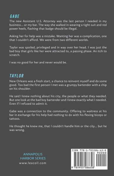 I was the bad boy that girls like her were attracted to... The new Assistant U.S. Attorney was the last person I needed in my business... or my bar. The way she walked in wearing a tight suit and red power heels, flashing that badge should be illegal. Asking her for help was a mistake. Wanting her was a complication, one that I couldn't afford. We were from two different worlds. Taylor was spoiled, privileged and in way over her head. I was just the bad boy that girls like her were attracted to, a passing phase. An itch to scratch. I was no good for her and never would be.