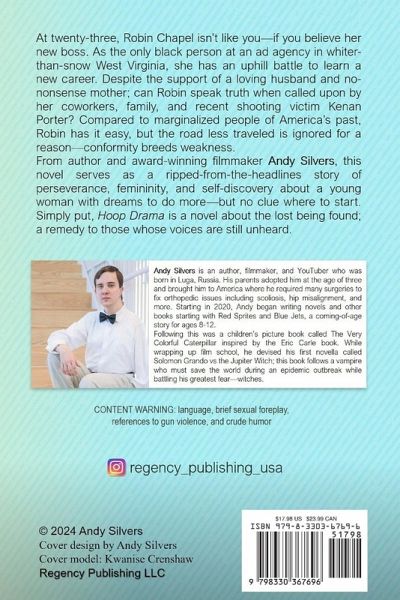 At twenty-three, Robin Chapel isn't like you-if you believe her new boss. As the only black person at an ad agency in whiter-than-snow West Virginia, she has an uphill battle to learn a new career. Despite the support of a loving husband and no-nonsense mother; can Robin speak truth when called upon by her coworkers, family, and recent shooting victim Kenan Porter? Compared to marginalized people of America's past, Robin has it easy, but the road less traveled is ignored for a reason-conformity breeds weakness. From author and award-winning filmmaker Andy Silvers, this novel serves as a ripped-from-the-headlines story of perseverance, femininity, and self-discovery about a young woman with dreams to do more-but no clue where to start. Simply put, Hoop Drama is a novel about the lost being found; a remedy to those whose voices are still unheard. For ages 16+