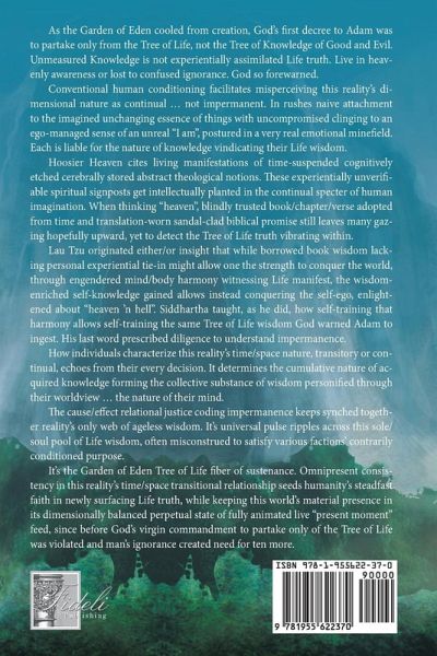 As the Garden of Eden cooled from creation, God's first decree to Adam was to partake only from the Tree of Life, not the Tree of Knowledge of Good and Evil. Unmeasured Knowledge is not experientially assimilated Life truth. Live in heavenly awareness or lost to confused ignorance. God so forewarned. Conventional human conditioning facilitates misperceiving this reality's dimensional nature as continual ... not impermanent. In rushes naive attachment to the imagined unchanging essence of things with uncompromised clinging to an ego-managed sense of an unreal "I am", postured in a very real emotional minefield. Each is liable for the nature of knowledge vindicating their Life wisdom. Hoosier Heaven cites living manifestations of time-suspended cognitively etched cerebrally stored abstract theological notions. These experientially unverifiable spiritual signposts get intellectually planted in the continual specter of human imagination. When thinking "heaven", blindly trusted book/chapter/verse adopted from time and translation-worn sandal-clad biblical promise still leaves many gazing hopefully upward, yet to detect the Tree of Life truth vibrating within. Lau Tzu originated either/or insight that while borrowed book wisdom lacking personal experiential tie-in might allow one the strength to conquer the world, through engendered mind/body harmony witnessing Life manifest, the wisdom-enriched self-knowledge gained allows instead conquering the self-ego, enlightened about "heaven 'n hell". Siddhartha taught, as he did, how self-training that harmony allows self-training the same Tree of Life wisdom God warned Adam to ingest. His last word prescribed diligence to understand impermanence. How individuals characterize this reality's time/space nature, transitory or continual, echoes from their every decision. It determines the cumulative nature of acquired knowledge forming the collective substance of wisdom personified through their worldview ... the nature of their mind. The cause/effect relational justice coding impermanence keeps synched together reality's only web of ageless wisdom. Its universal pulse ripples across this sole/soul pool of Life wisdom, often misconstrued to satisfy various factions' contrarily conditioned purpose. It's the Garden of Eden Tree of Life fiber of sustenance. Omnipresent consistency in this reality's time/space transitional relationship seeds humanity's steadfast faith in newly surfacing Life truth, while keeping this world's material presence in its dimensionally balanced perpetual state of fully animated live "present moment" feed, since before God's virgin commandment to partake only of the Tree of Life was violated and man's ignorance created need for ten more.