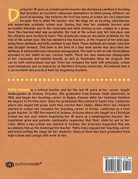 During her 18 years as a kindergarten teacher she developed a method of teaching that provides an excellent classroom atmosphere in which young children can excel in learning. She believes the first two weeks of school are very important because that is when the teacher sets the stage for an exciting, adventurous and memorable academic school year. During that time her students learned what acceptable behavior was in the classroom and while moving across campus as a group. Once they learned what was acceptable, the rest of the school year fell into place and the children were excited to learn. This drastically reduces discipline problems for the rest of the school year. She has mentored two teachers, at the request of her principal, using these methods and both continue to use them. These methods are simple, effective and straight forward. This book is the first of a four book series that describes her methods of instruction and classroom management. The book is full of cute illustrations provided by her sister-in-law, Carolyn Smith. There are also numerous photographs of her classroom and bulletin boards, as well as illustrated ideas for projects that can be both instructional and fun. Patty has reviewed the book with principals, school superintendants and an instructor at Northern Arizona University. All believed that it is an excellent and practical book for beginning teachers.