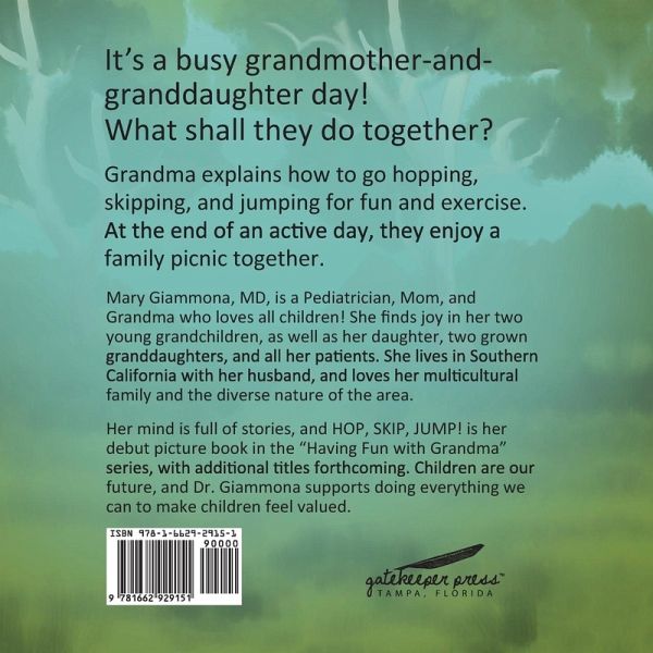 Mary Giammona, MD, is a Pediatrician, Mom, and Grandma who loves all children! She finds joy in her two young grandchildren, as well as her daughter, two grown granddaughters, and all her patients. She lives in Southern California with her husband, and loves her multicultural family and the diverse nature of the area.Her mind is full of stories, and HOP, SKIP, JUMP! is her debut picture book in the "Having Fun with Grandma" series, with additional titles forthcoming. Children are our future, and Dr. Giammona supports doing everything we can to make children feel valued.