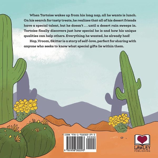 When Tortoise wakes up from his long winter nap, all he wants is lunch. On his search for tasty treat, he realizes that all of his desert friends have a special talent, but he doesn't... until a desert rain sweeps in. Tortoise finally discovers just how special he is, and how his unique qualities can help others. Everything he wanted, he already had! Hop, Vroom, Skitter is a story of self-love perfect for sharing with anyone who seeks to know what special gifts lie within them.