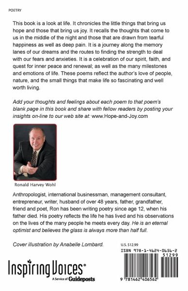 This book is a look at life. It chronicles the little things that bring us hope and those that bring us joy. It recalls the thoughts that come to us in the middle of the night and those that are drawn from tearful happiness as well as deep pain. It is a journey along the memory lanes of our dreams and the routes to finding the strength to deal with our fears and anxieties. It is a celebration of our spirit, faith, and quest for inner peace and renewal; as well as the many milestones and emotions of life. These poems reflect the author's love of people, nature, and the small things that make life so fascinating and well worth living. Add your thoughts and feelings about each poem to that poem's blank page in this book and share with fellow readers by posting your insights on-line to our web site at: www.Hope-and-Joy.com