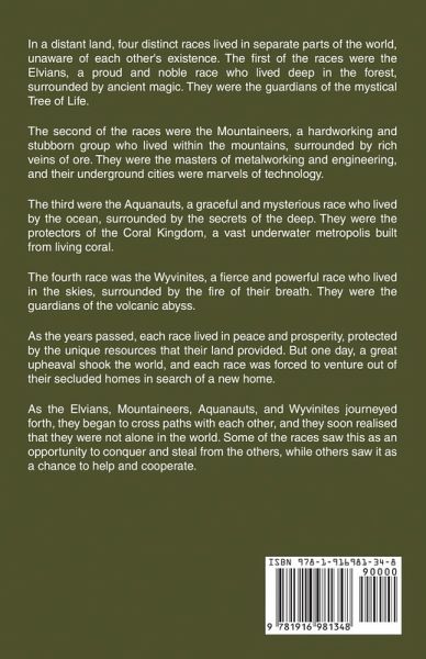 In a distant land, four distinct races lived in separate parts of the world, unaware of each other's existence. The first of the races were the Elvians, a proud and noble race who lived deep in the forest, surrounded by ancient magic. They were the guardians of the mystical Tree of Life. The second of the races were the Mountaineers, a hardworking and stubborn group who lived within the mountains, surrounded by rich veins of ore. They were the masters of metalworking and engineering, and their underground cities were marvels of technology. The third were the Aquanauts, a graceful and mysterious race who lived by the ocean, surrounded by the secrets of the deep. They were the protectors of the Coral Kingdom, a vast underwater metropolis built from living coral. The fourth race was the Wyvinites, a fierce and powerful race who lived in the skies, surrounded by the fire of their breath. They were the guardians of the volcanic abyss. As the years passed, each race lived in peace and prosperity, protected by the unique resources that their land provided. But one day, a great upheaval shook the world, and each race was forced to venture out of their secluded homes in search of a new home. As the Elvians, Mountaineers, Aquanauts, and Wyvinites journeyed forth, they began to cross paths with each other, and they soon realised that they were not alone in the world. Some of the races saw this as an opportunity to conquer and steal from the others, while others saw it as a chance to help and cooperate.
