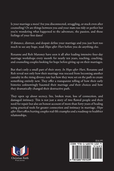 Let's face it ... Relationships can be hard. Friendships require patience. Marriage is both joyful and heart-breaking at times. Do you feel stuck in old patterns, or are you wondering what happened to the adventure, the passion, and those feelings of your first dates? Opening up about secrecy, lies, broken trust, loss of connection, and damaged intimacy, this is not just a story of two flawed people and their need for repair but also an honest account of more than forty years of healing using practical tools for greater connection and intimacy in marriage. Hope After Hurt offers real-life examples and a roadmap to healthier relationships for all couples. Whether you're single, dating or married this book will transform your relationship. If you struggle to find hope, read Hope after Hurt before you do anything else. After leading marriage workshops every month for ten years along with a private practice of teaching, coaching, and counseling couples looking for hope before giving up, Roxanne and Rob Maroney have seen it all. But that's only a small part of their story. In Hope After Hurt, Roxanne and Rob reveal how their marriage was rescued from becoming another casualty and how they learned to create something entirely new. They offer a transparent telling of how their early histories unknowingly haunted their marriage and their choices and how they dramatically changed their destructive path.