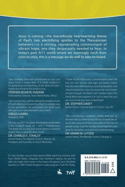 Jesus is coming! The marvellously heartwarming theme of Paul's two electrifying epistles to the Thessalonian believers is a stirring, rejuvenating communiqué of vibrant hope, one they desperately needed to hear. In today's post 9/11 world, where we seemingly lurch from crisis to crisis, this is a message we'd do well to take on board. In Hope and Glory, Sam Gordon takes the reader verse by verse through a careful study of these two epistles and communicates a vibrant message of hope for Christians of all ages. Also available in the Truth for Today series by Sam Gordon: * Revelation: Worthy is the Lamb * 1, 2, and; 3 John: Living in the Light * Jude: Fighting Truth Decay * Ephesians: The Genius of Grace * Philippians: An Odyssey of Joy "Dr. Sam Gordon has given the student of the Bible a fine in-depth study on 1 and 2 Thessalonians. This book will exceed your expectations in what to expect from a verse by verse study." Dr. Charles F. Stanley Senior Pastor, First Baptist Church, Atlanta, GA President and Founder, In Touch Ministries