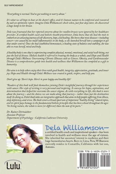 "Many people don't know that to achieve health and wellness, it takes much more than eating healthy and exercising; we need to look at the different dimensions of health that affect our well-being," Williamson says. In her book, she discusses these aspects of well-being as well as information about how sleep, food and stress affect a person's overall health. She also points out how different healing modalities can work together. Don't give up. There's hope. "Readers of this book will find themselves joining Dela's insightful journey through her experiences with cancer. This book is more about the journey and the choices we can make along that journey. The book covers a broad spectrum of important "healthy living" related topics, and its spirit pays homage to the fundamental holistic principle that has been echoed throughout the ages: "In living nature, the whole is more (or different) than the sum of its parts." Dr. Rainer Diriwächter, CLU