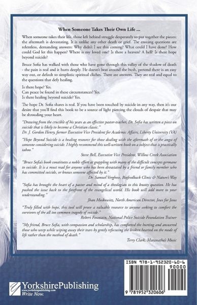 When someone takes their life, those left behind struggle desperately to put together the pieces; the aftermath is devastating. It is unlike any other death or grief. The ensuing questions are relentless, demanding answers: Why didn't I see this coming? What could I have done? How could God let this happen? Where is my loved one? Is there a heaven? A hell? Is there hope beyond suicide? Bruce Sofia has walked with those who have gone through this valley of the shadow of death - the pain is real and it hurts deeply. He doesn't beat around the bush, pretend there is an easy way out, or default to simplistic spiritual cliches. There are answers. They are real and equal to the questions that defy healing. Is there hope? Yes. Can peace be found in these circumstances? Yes. Is there healing beyond suicide? Yes. The hope Dr. Sofia shares is real. If you have been touched by suicide in any way, then it's our desire that you'll find this book to be a source of light piercing the clouds of despair that may be shrouding your heart.