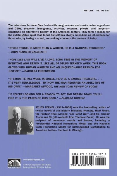 America's most inspirational voices, in their own words: "If you're looking for a reason to act and dream again, you'll find it in the pages of this book" (Chicago Tribune). Published when Studs Terkel was ninety-one years old, this astonishing oral history tackles one of the famed journalist's most elusive subjects: Hope. Where does it come from? What are its essential qualities? How do we sustain it in the darkest of times? An alternative, more personal chronicle of the "American century," Hope Dies Last is a testament to the indefatigable spirit that Studs has always embodied, and an inheritance for those who, by taking a stand, are making concrete the dreams of today. A former death row inmate who served nearly twenty years for a crime he did not commit discusses his never-ending fight for justice. Tom Hayden, author of The Port Huron Statement, contemplates the legacy of 1960s student activism. Liberal economist John Kenneth Galbraith reflects on the enduring problem of corporate malfeasance. From a doctor who teaches his young students compassion to the retired brigadier general who flew the Enola Gay over Hiroshima, these interviews tell us much about the power of the American dream and the force of individuals who advocate for a better world. With grace and warmth, Terkel's subjects express their secret hopes and dreams. Taken together, this collection of interviews tells an inspiring story of optimism and persistence, told in voices that resonate with the eloquence of conviction. "The value of Hope Dies Last lies not in what it teaches readers about its narrow subject, but in the fascinating stories it reveals, and the insight it allows into the vast range of human experience." -The A.V. Club "Very Terkelesque-by now the man requires an adjective of his own." -Margaret Atwood, The New York Times Review of Books "An American treasure." -Cornel West