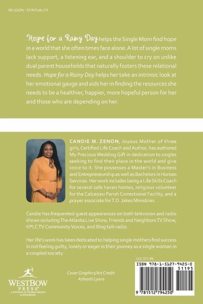 Hope for a Rainy Day helps the Single Mom find hope in a world that she often times face alone. A lot of single moms lack support, a listening ear, and a shoulder to cry on unlike dual parent households that naturally fosters these relational needs. Hope for a Rainy Day helps her take an intrinsic look at her emotional gauge and aids her in finding the resources she needs to be a healthier, happier, more hopeful person for her and those who are depending on her.