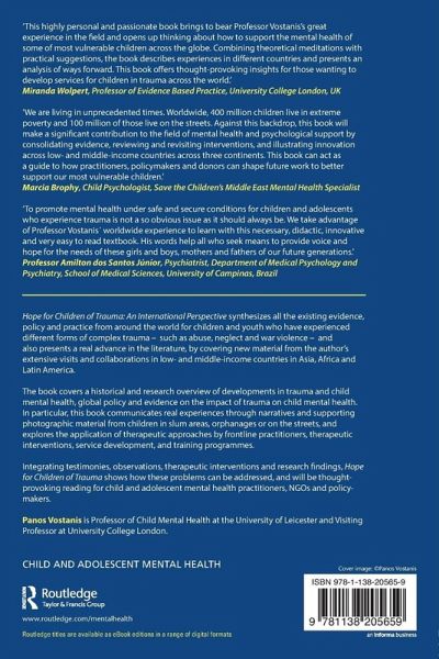 Hope for Children of Trauma: An International Perspective synthesizes all the existing evidence, policy and practice from around the world for children and youth who have experienced different forms of complex trauma - such as abuse, neglect and war violence - and also presents a real advance in the literature, by covering new material from the author's extensive visits and collaborations in low and middle-income countries in Asia, Africa and Latin America. The book covers a historical and research overview of developments in trauma and child mental health, global policy and evidence on the impact of trauma on child mental health. In particular, this book communicates real experiences through narratives and supporting photographic material from children in slum areas, orphanages or on the streets, and explores the application of therapeutic approaches by frontline practitioners, therapeutic interventions, service development and training programmes. Integrating testimonies, observations, therapeutic interventions and research findings, Hope for Children of Trauma shows how these problems can be addressed, and will be thought-provoking reading for child and adolescent mental health practitioners, NGOs and policy-makers.