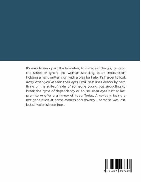 It's easy to walk past the homeless, to disregard the guy lying on the street or ignore the woman standing at an intersection holding a handwritten sign with a plea for help. It's harder to look away when you've seen their eyes. Look past lines drawn by hard living or the still-soft skin of someone young but struggling to break the cycle of dependency or abuse. Their eyes hint at lost promise or offer a glimmer of hope. Today, America is facing a lost generation at homelessness and poverty........paradise was lost, but salvation's been free...
