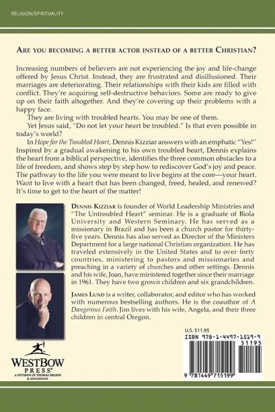 Are you becoming a better actor instead of a better Christian? Increasing numbers of believers are not experiencing the joy and life-change offered by Jesus Christ. Instead, they are frustrated and disillusioned. Their marriages are deteriorating. Their relationships with their kids are filled with conflict. They're acquiring self-destructive behaviors. Some are ready to give up on their faith altogether. And they're covering up their problems with a happy face. They are living with troubled hearts. You may be one of them. Yet Jesus said, "Do not let your heart be troubled." Is that even possible in today's world? In Hope for the Troubled Heart, Dennis Kizziar answers with an emphatic "Yes!" Inspired by a gradual awakening to his own troubled heart, Dennis explains the heart from a biblical perspective, identifies the three common obstacles to a life of freedom, and shows step by step how to rediscover God's joy and peace. The pathway to the life you were meant to live begins at the core-your heart. Want to live with a heart that has been changed, freed, healed, and renewed? It's time to get to the heart of the matter!