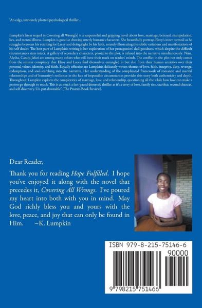 "An edgy, intricately plotted psychological thriller... Lumpkin's latest sequel in Covering all Wrong[s] is a suspenseful and gripping novel about love, marriage, betrayal, manipulation, lies, and mental illness. Lumpkin is good at drawing utterly humane characters. She beautifully portrays Elroy's inner turmoil as he struggles between his yearning for Lacey and doing right by his faith, astutely illustrating the subtle variations and manifestations of his self-doubt. The best part of Lumpkin's writing is her exploration of her protagonists' dull goodness, which despite the difficult circumstances stays intact. A gallery of secondary characters, pivotal to the plot, is infused into the narrative simultaneously: Nina, Alysha, Candy, Jafari are among many others who will leave their mark on readers' minds. The conflict in the plot not only comes from the sinister conspiracy that Elroy and Lacey find themselves entangled in but also from their human anxieties over their personal values, identity, and faith. Equally effective are Lumpkin's delicately woven themes of love, faith, integrity, duty, revenge, redemption, and soul-searching into the narrative. Her understanding of the complicated framework of romantic and marital relationships and of humanity's resilience in the face of impossible circumstances provides this story both authenticity and depth. Throughout, Lumpkin explores the complexities of marriage, love, and relationship, questioning all the while how love can make a person go through so much. This is as much a fast-paced domestic thriller as it's a story of love, family ties, sacrifice, second chances, and self-discovery. Un-put-downable" (The Prairies Book Review).