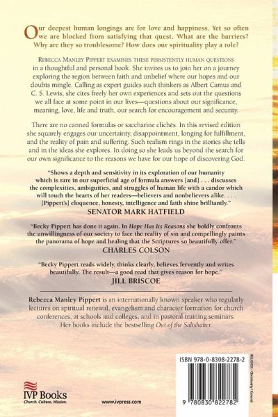 You long for love and happiness. But so often you are blocked from satisfying that longing. What are the barriers? Why are they so troublesome? How does spirituality play a role?Rebecca Manley Pippert examines these persistently human questions in this thoughtful and personal book. She invites you to join her on a journey exploring the region between faith and unbelief where your hopes and doubts mingle. Calling as expert guides such thinkers as Albert Camus and C. S. Lewis, she cites freely her own experiences and sets out the questions all face--questions about significance, meaning, love, life and truth, the search for encouragement and security.Pippert offers no canned formulas or saccharine cliches. In this revised and updated edition she squarely engages your uncertainty, disappointment, longing for fulfillment, and the reality of pain and suffering. Such realism rings in the stories she tells and in the ideas she explores. In doing so she leads you beyond the search for your own significance to the reasons you have for your hope of discovering God.
