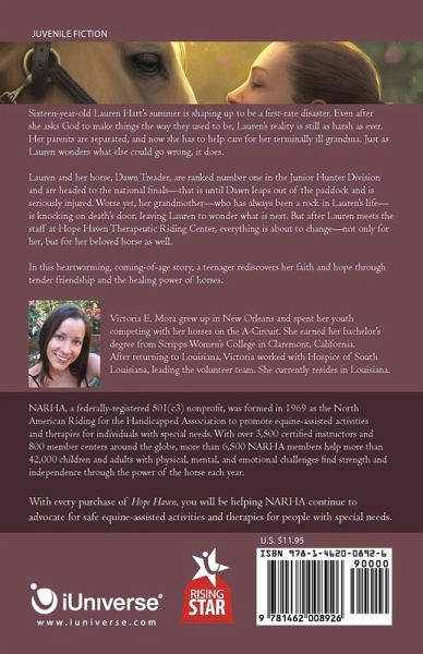 Sixteen-year-old Lauren Hart¿s summer is shaping up to be a first-rate disaster. Even after she asks God to make things the way they used to be, Lauren¿s reality is still as harsh as ever. Her parents are separated, and now she has to help care for her terminally ill grandma. Just as Lauren wonders what else could go wrong, it does. Lauren and her horse, Dawn Treader, are ranked number one in the Junior Hunter Division and are headed to the national finals¿that is until Dawn leaps out of the paddock and is seriously injured. Worse yet, her grandmother¿who has always been a rock in Lauren¿s life¿is knocking death¿s door, leaving Lauren to wonder what is next. But after Lauren meets the staff at Hope Haven Therapeutic Riding Center, everything is about to change¿not only for her, but for her beloved horse as well. In this heartwarming, coming-of-age story, a teenager rediscovers her faith and hope through tender friendship and the healing power of horses. PATH International, formerly NARHA, is a federally-registered 501(c3) nonprofit and was formed in 1969 as the North American Riding for the Handicapped Association to promote equine-assisted activities and therapies for individuals with special needs. More than 6,500 PATH Intl. members help more than 42,000 children and adults with physical, mental and emotional challenges find strength and independence through the power of the horse each year. With every purchase of Hope Haven, you will be helping PATH Intl. continue to advocate for safe equine-assisted activities and therapies for people with special needs.