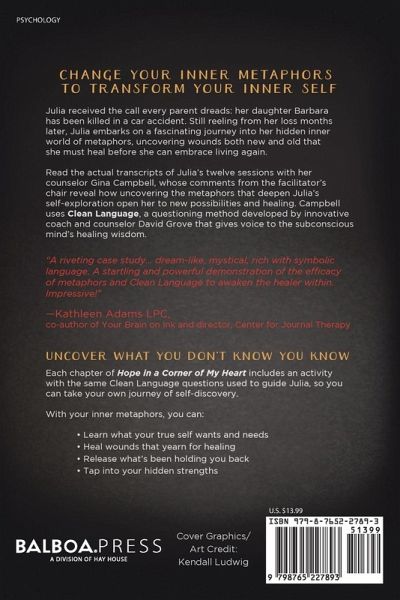 Julia received the call every parent dreads: her daughter Barbara has been killed in a car accident. Still reeling from her loss months later, Julia embarks on a fascinating journey into her inner world of metaphors, uncovering wounds both new and old that she must heal before she can embrace living again. Read the actual transcripts of Julia's twelve sessions with her counselor Gina Campbell, whose comments from the facilitator's chair reveal how uncovering the metaphors that deepen Julia's self-exploration open her to new possibilities and healing. Campbell uses Clean Language-a questioning method developed by innovative coach and counselor David Grove that gives voice to the subconscious mind's healing wisdom. A deep respect for Julia's self-directed journey shines through Campbell's patient questions that lead to surprisingly profound discoveries. Each chapter of Hope in a Corner of My Heart includes an activity with the same Clean Language questions used to guide Julia so you can take your own journey to get to better know your best self.
