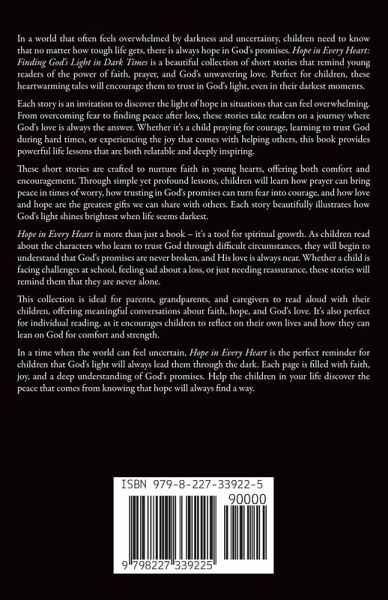 In a world that often feels overwhelmed by darkness and uncertainty, children need to know that no matter how tough life gets, there is always hope in God's promises. Hope in Every Heart: Finding God's Light in Dark Times is a beautiful collection of short stories that remind young readers of the power of faith, prayer, and God's unwavering love. Perfect for children, these heartwarming tales will encourage them to trust in God's light, even in their darkest moments. Each story is an invitation to discover the light of hope in situations that can feel overwhelming. From overcoming fear to finding peace after loss, these stories take readers on a journey where God's love is always the answer. Whether it's a child praying for courage, learning to trust God during hard times, or experiencing the joy that comes with helping others, this book provides powerful life lessons that are both relatable and deeply inspiring. These short stories are crafted to nurture faith in young hearts, offering both comfort and encouragement. Through simple yet profound lessons, children will learn how prayer can bring peace in times of worry, how trusting in God's promises can turn fear into courage, and how love and hope are the greatest gifts we can share with others. Each story beautifully illustrates how God's light shines brightest when life seems darkest. Hope in Every Heart is more than just a book - it's a tool for spiritual growth. As children read about the characters who learn to trust God through difficult circumstances, they will begin to understand that God's promises are never broken, and His love is always near. Whether a child is facing challenges at school, feeling sad about a loss, or just needing reassurance, these stories will remind them that they are never alone. This collection is ideal for parents, grandparents, and caregivers to read aloud with their children, offering meaningful conversations about faith, hope, and God's love. It's also perfect for individual reading, as it encourages children to reflect on their own lives and how they can lean on God for comfort and strength. In a time when the world can feel uncertain, Hope in Every Heart is the perfect reminder for children that God's light will always lead them through the dark. Each page is filled with faith, joy, and a deep understanding of God's promises. Help the children in your life discover the peace that comes from knowing that hope will always find a way.