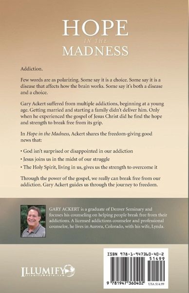 Addiction. Few words are as polarizing. Some say it is a choice. Some say it is a disease that affects how the brain works. Some say it's both a disease and a choice. Gary Ackert suffered from multiple addictions, beginning at a young age. Getting married and starting a family didn't deliver him. Only when he experienced the gospel of Jesus Christ did he find the hope and strength to break free from its grip. In Hope in the Madness, Ackert shares the freedom-giving good news that: ¿ God isn't surprised or disappointed in our addiction ¿ Jesus joins us in the midst of our struggle ¿ The Holy Spirit, living in us, gives us the strength to overcome it Through the power of the gospel, we really can break free from our addiction. Gary Ackert guides us through the journey to freedom.