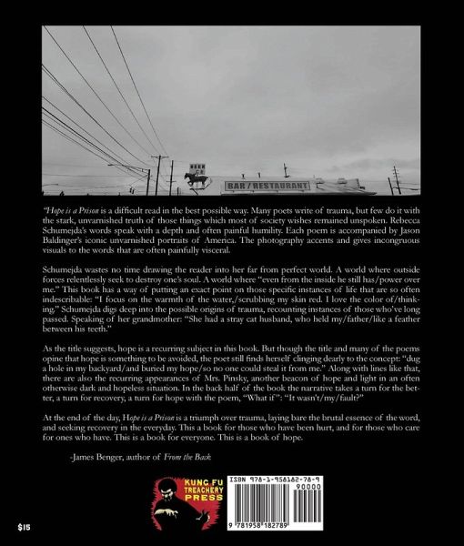 "Rebecca Schumejda's Hope is a Prison is a gut-wrenching collection of poems shining an interrogation room light on the intersecting narratives connecting multiple victims of abuse. The familiar threads of poverty, family denial, shame, and failure of social safeguards are told in mostly short pieces that have been crafted with sharp detail, delivering the kind of visceral punch that stays with you for days after reading. These poems are best read in sequence like a short story. Stark black and white photographs, by Jason Baldinger further emphasize the cold rooms and environments where the events unfold. Rebecca Schumejda's voice is steeped in the immense humanity and experience of what she writes. With Hope is a Prison, she's created a heavy, vital accounting of intergenerational abuse that has the power to break your heart. It also has the power to redeem. The words of main protagonist, Liberty Zerillo, as she reflects on her journey of survival, "It's the simple acts of kindness that kept me alive," end this story with a glimmer of resonant light. It's the most that any of us can hope for." -Wendy Raney, Author of Girl on the Highway "A grim tale with trash fairy overtones, Rebecca Schumejda's new chapbook, "Hope is a Prison," is at once chaotic and reasonable. The threads of the story may confuse at first, just as in this life. On closer reading, it's a chronicle of how one sin begets another, how a cloak of formal religion can conceal a bitter truth beneath. There's a confusion of blame, assistance, denial and finally, the horror of epiphany. The main narrator, a young girl named, "Liberty," is at anything but. She is surrounded by others equally damaged, equally hobbled. With lines like, "...stray cat husband who held my father like a feather between his teeth," this is Schumejda at the height of her considerable powers, understatement that softly wallops the reader. Jason Baldinger's grainy photos set the scene, with shots of decayed carousels and other signs of abandonment's loss. They reflect unfathomable serenity in the aftermath of the deeds described." -Cheryl A. Rice, Author of Love's Compass