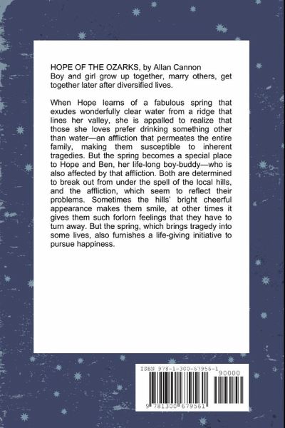 When Hope learns of a fabulous spring that exudes wonderfully clear water from a ridge that lines her valley, she is appalled to realize that those she loves prefer drinking something other than water-an affliction that permeates the entire family, making them susceptible to inherent tragedies. But the spring becomes a special place to Hope and Ben, her life-long boy-buddy-who is also affected by that affliction. Both are determined to break out from under the spell of the local hills, and the affliction, which seem to reflect their problems. Sometimes the hills' bright cheerful appearance makes them smile, at other times it gives them such forlorn feelings that they have to turn away. But the spring, which brings tragedy into some lives, also furnishes a life-giving initiative to pursue happiness.