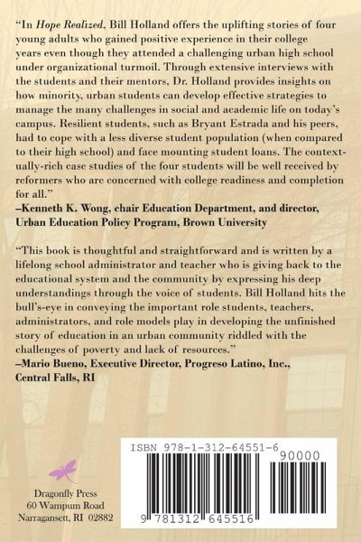Four students Bryant Estrada, Guillermo Ronquillo, Theresa Agonia, and George Carle graduated in 2009 from a small poverty stricken, low performing urban city high school on the outskirts of Providence, Rhode Island, and attended four different colleges. Fifty-two percent of their classmates had dropped out at Central Falls High, and after a union dispute in 2010 caused by a federal and state mandate, all high school teachers were fired. This action resulted in the school becoming the national poster child for high school "drop-out factories." In a press conference, even President Obama weighed in and supported the mass teacher firing. Hope Realized goes beyond the research and rhetoric as the students describe the highs and lows of their college journeys.Teachers and school reformers can learn much from their compelling and insightful stories.