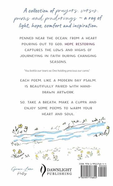 Hope Restoring is book one in the Grace Lane Poetry collection. Featuring prayers, poems and ponderings ~ a ray of light, hope, comfort and inspiration. 'You bottle our tears as One holding precious our cares.' Penned near the ocean, from a heart pouring out to God, Hope Restoring captures the lows and highs of journeying in faith during changing seasons. Each prayer poem, like a modern day psalm, and scripture verse is beautifully paired with hand-drawn artwork. So take a breath, make a cuppa and enjoy some poems to warm your heart and soul today. Grace Lane Poetry collection: Hope Restoring Hope Renewing Hope Everlasting