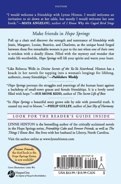 Make friends in Hope Springs Pull up a chair and discover the strength and sustenance of friendship with Jessie, Margaret, Louise, Beatrice, and Charlotte, as the unique bond forged between these five remarkable women is put to the test when one of their own is stricken with a deadly illness. Filled with the mystery and wonder that make life worthwhile, Hope Springs will lift your spirits and warm your heart.