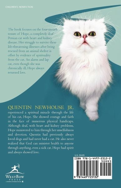 The book focuses on the four-month tenure of Hope, a completely deaf Persian cat with heart and kidney disease. Her struggle to survive these life-threatening illnesses after being rescued from an animal shelter is offset by evidence of spirituality from the cat. An alarm and lap cat, even though she was chronically ill, Hope always returned love.