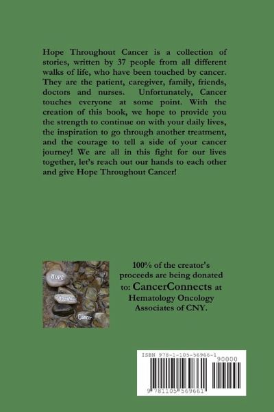 Hope Throughout Cancer is a collection of stories, written by 37 people from all different walks of life, who have been touched by cancer. They are the patient, caregiver, family, friends, doctors and nurses. Unfortunately, Cancer touches everyone at some point. With the creation of this book, we hope to provide you the strength to continue on with your daily lives, the inspiration to go through another treatment, and the courage to tell a side of your cancer journey! We are all in this fight for our lives together, let's reach out our hands to each other and give Hope Throughout Cancer!