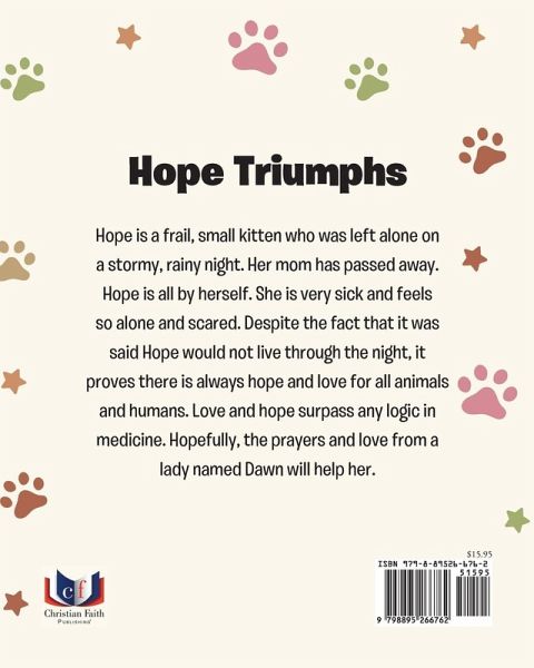 Hope Triumphs Hope is a frail, small kitten who was left alone on a stormy, rainy night. Her mom has passed away. Hope is all by herself. She is very sick and feels so alone and scared. Despite the fact that it was said Hope would not live through the night, it proves there is always hope and love for all animals and humans. Love and hope surpass any logic in medicine. Hopefully, the prayers and love from a lady named Dawn will help her.