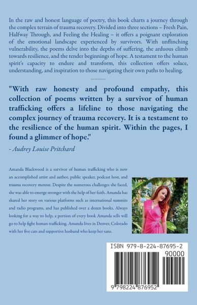 In the raw and honest language of poetry, this book charts a journey through the complex terrain of trauma recovery. Divided into three sections - Fresh Pain, Halfway Through, and Feeling the Healing - it offers a poignant exploration of the emotional landscape experienced by survivors. With unflinching vulnerability, the poems delve into the depths of suffering, the arduous climb towards resilience, and the tender beginnings of hope. A testament to the human spirit's capacity to endure and transform, this collection offers solace, understanding, and inspiration to those navigating their own paths to healing. "With raw honesty and profound empathy, this collection of poems written by a survivor of human trafficking offers a lifeline to those navigating the complex journey of trauma recovery. It is a testament to the resilience of the human spirit. Within the pages, I found a glimmer of hope for my very own sister." -Audrey Louise Pritchard