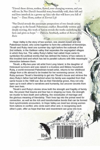 Hope Valley is the story of two women, one Jewish-Israeli and one Palestinian-Israeli, who come together to form the unlikeliest of friendships. Tikvah and Ruby meet one summer day right before the outbreak of the 2nd intifada, in the Galilean valley that separates the segregated villages in which they live. The valley Ruby's father had called Hope came to symbolize the political enmity that has defined the history of two nations in this troubled land and which has led to parallel cultures with little meaningful interaction between them. Tikvah, a fifty-two-year old artist from Long Island, is the daughter of Holocaust survivors and was raised in a loveless and lifeless household. Ruby, a world-renowned Palestinian-Israeli artist, returns to her childhood village from a life abroad to be treated for her worsening cancer. At first, Ruby pursues Tikvah's friendship to get into Tikvah's house and retrieve the diary Ruby's father had left behind when his family was expelled from that same house in the 1948 war. But as their friendship grows, they not only open up to each other's narratives and humanity, but uncover secrets from their own lives. Tikvah's and Ruby's stories show both the strength and fragility of family ties, the power that trauma and fear has in shaping our lives, the strength we muster to face death and suffering, the vicissitudes of marriage and the glorious meaning of friendship. Their lives tap into the primal need for connection, as well as the rich and transformative bonds that can be formed from synchronistic encounters. In Hope Valley we meet two strong women from nations in conflict, who circle each other and, in recognizing each other's pain, offer us hope that fear and resentment can grow into love.
