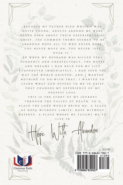 Because my father died while I was quite young, adults around me were often open about their experiences of grief. The common theme seemed to be "Abandon hope all ye who enter here." You never move on; you never "get over it." So when my husband was killed very suddenly and unexpectedly, the hopes and dreams I had held for my life evaporated immediately. I had seen the way the world grieved, and I wanted nothing to do with that. I wanted to learn what God offers to me in grief that changes my experience of my deepest loss. This is the story of my journey through the valley of death, to a place the Lord would bring me. A place of hope without limits, hope without reserve. A place where He taught me to live in hope with abandon.