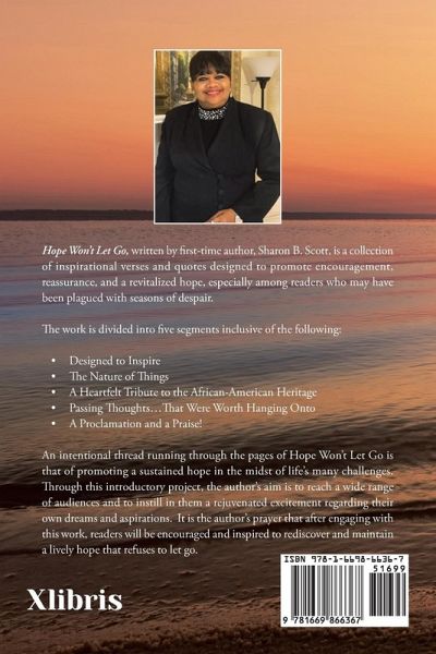 Hope Won't Let Go, written by first-time author, Sharon B. Scott, is a collection of inspirational verses and quotes designed to promote encouragement, reassurance, and a revitalized hope, especially among readers who may have been plagued with seasons of despair. The work is divided into five segments inclusive of the following: ¿ Designed to Inspire ¿ The Nature of Things ¿ A Heartfelt Tribute to the African-American Heritage ¿ Passing Thoughts...That Were Worth Hanging Onto ¿ A Proclamation and a Praise! An obvious thread running through the pages of Hope Won't Let Go is that of promoting a sustained hope in the midst of life's many challenges. Through this introductory project, the author's aim is to reach a wide range of audiences and to instill in them a rejuvenated excitement regarding their own dreams and aspirations. It is the author's prayer that after engaging with this work, readers will be encouraged and inspired to rediscover and maintain a lively hope that refuses to let go.