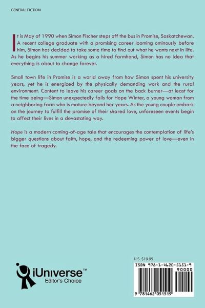 It is May of 1990 when Simon Fischer steps off the bus in Promise, Saskatchewan. A recent college graduate with a promising career looming ominously before him, Simon has decided to take some time to fi nd out what he wants next in life. As he begins his summer working as a hired farmhand, Simon has no idea his life is about to change forever. Small town life in Promise is a world away from how Simon spent his university years, yet he is energized by the physically demanding work and the rural environment. Content to leave his career goals on the back burner-at least for the time being-Simon unexpectedly falls for Hope Winter, a young woman from a neighboring farm who is mature beyond her years. As the young couple embark on the journey to fulfi ll the promise of their shared love, unforeseen events are about to affect their lives in a devastating way.
