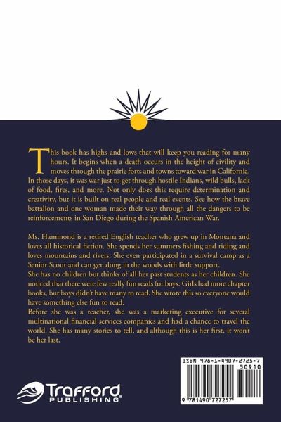 This book has highs and lows that will keep you reading for many hours. It begins when a death occurs in the height of civility and moves through the prairie forts and towns toward war in California. In those days, it was war just to get through hostile Indians, wild bulls, lack of food, fires, and more. Not only does this require determination and creativity, but it is built on real people and real events. See how the brave battalion and one woman made their way through all the dangers to be reinforcements in San Diego during the Spanish American War.