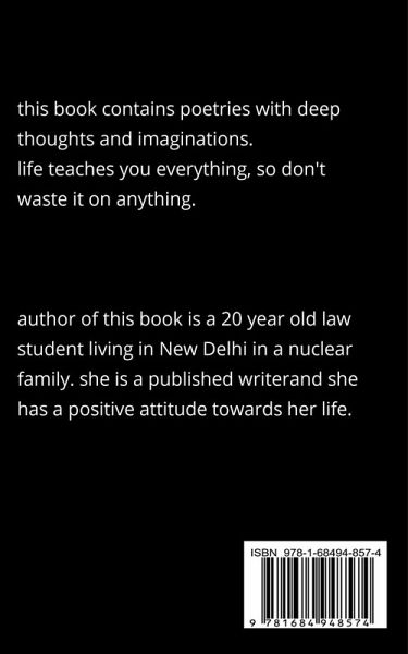 this book contains poetries with deep thoughts and imaginations. these poems have a lot to relate with real life of people. we all have life, dreams and problems but we have to make the best use of our life, so live your life with no regretts. dont expect from anyone just accept.