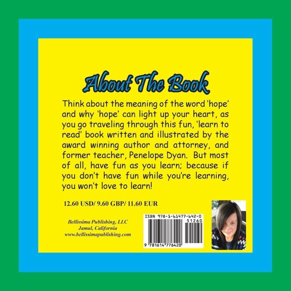Our heroine's mother suddenly quotes Alexander Pope and tells our heroine, "Hope springs eternal in the human breast." And this leaves our heroine dumbfounded once again, and not knowing what her mother means. In fact, she thinks maybe her mother is having a bad day! So, she proceeds to talk to everyone she can think of (beginning with the elephant) to see if they can help her figure out what her mother meant! Think about what it means to keep hope in our hearts, and why this is important, as you practice your reading skills and build your reading word vocabulary through word recognition, word repetition and rhyme, all of which you will find on the pages this fun-filled 'learn to read' book written and illustrated by the award winning author, attorney and former K-6 teacher, Penelope Dyan. But most of all, have fun as you learn; because learning must be (and should always be) fun! Then, when you are all finished traveling through this book, you can go to Bellissimavideo's YouTube channel and watch the free, fun music video that goes with this book!