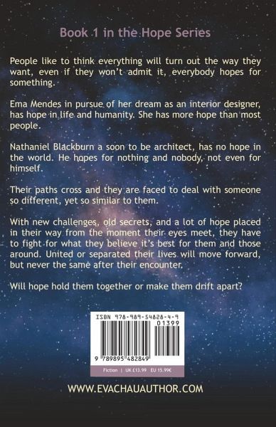 In darkness, the only way for love to shine is through...hope. Sweet, kind and strong-headed Ema Mendes moved to London with a goal in mind: to get her degree to become a successful interior designer. That's what she worked her whole life for.Until those mysterious caramel-eyes caught her attention. She knows he's an infuriating distraction, one she swore off.He's her roommate's brother. Her partner in class. The only one who can bring out emotions she's never felt.He continuously shakes her hope in humanity until...he becomes her first love. *** Ruthless, cold and successful Nathaniel Blackburn has all the university's girls at his feet, but after what happened last year he has only one rule: he won't sleep with the same girl more than once.What he wasn't expecting was the lost girl he met on campus to be his sister's roommate. The one who should be off limits.She drives him insane in every way, but is also the reason he's able to sleep well at night.Her hope in the world is something he mocks until...she teaches him the meaning of love. She saw the darkness. He saw the light. They found each other. ¿Hope is a New Adult Contemporary Romance with grumpy/sunshine, roommate's brother, forced proximity, inexperienced/experienced and college tropes.
